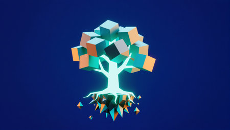 A vivid tree made of geometric shapes illuminates the dark blue background as it grows.