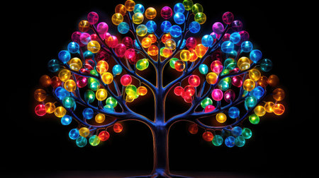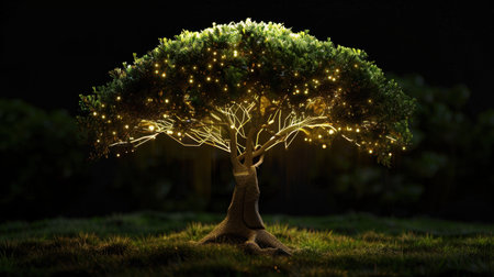Glowing tree with luminous branches and vibrant foliage stands majestically dark setting, creating magical atmosphere. natural beauty of tree is enhanced by soft illumination, evoking sense