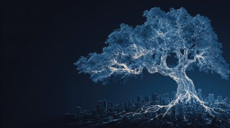An illuminated digital tree is depicted against a dark background, showcasing intricate details and a modern aesthetic. The artwork features a glowing effect with bright blue hues. This image could be utilized for various commercial purposes, including website design, digital art projects, and conceptual illustrations.