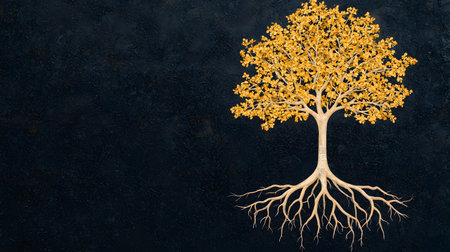 The image features a golden tree with intricate roots, set against a deep black background, evoking richness. It symbolizes wealth and nature, with a peaceful atmosphere that captivates.