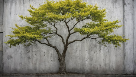 A stunning image of a vibrant green tree standing alone on a modern pavement, casting gentle shadows, symbolizing harmony and resilience in urban landscapes.
