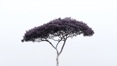 A solitary tree with a striking curved canopy is depicted against a soft white backdrop, highlighting its unique form and serene environment, evoking a sense of calm.