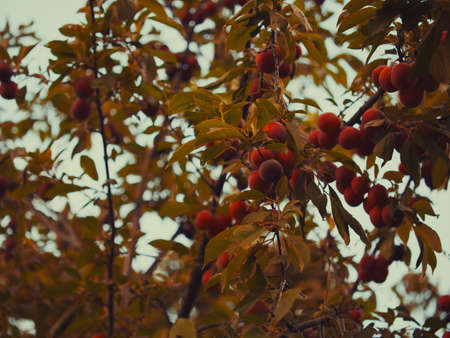 There are a lot of ripe cherry plum berries hanging on a tree branch.