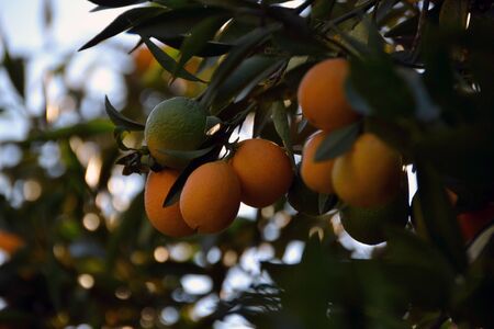 Tangerines on a tree in the garden at sunset. Shallow depth of field