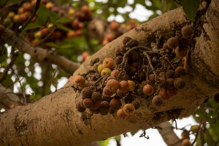 Green figs ripening on the tree in sunshine. Figs of Asia