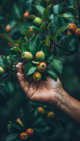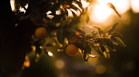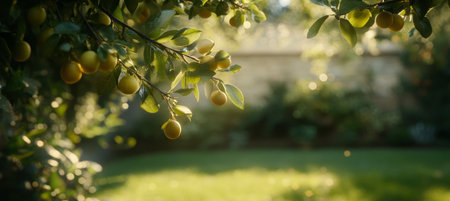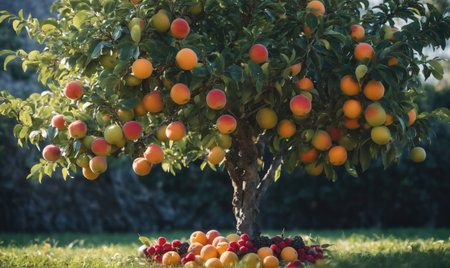 Golden Hour in the Orchard Sun-Kissed Fruits, Lush Greenery, and Tranquil Garden Setting.
