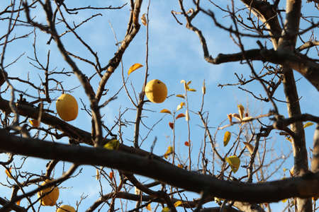 Ripe yellow Korean pears on the tree againt the blue sky in autumn, South Korea