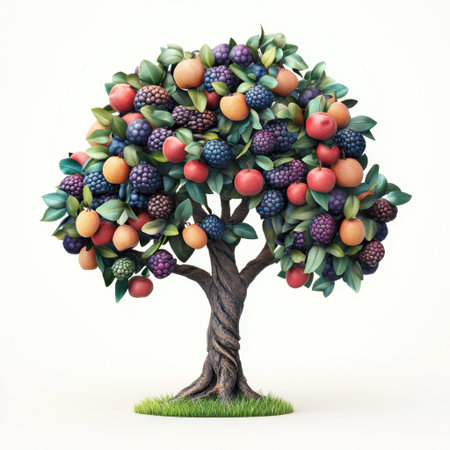 A beautifully arranged fruit tree bursting with colorful fruits like oranges, apples, and lemons. Perfect for concepts of nature, food, and healthy living.