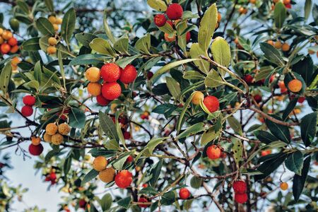 Foreground of arbutus unedo fruits and tree