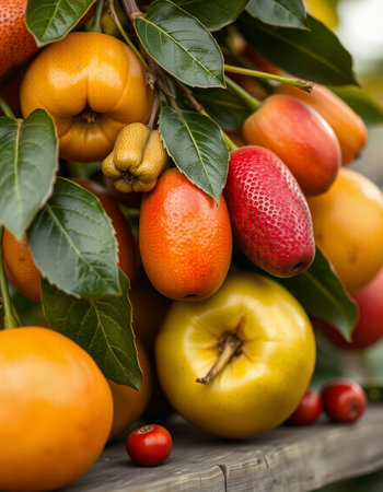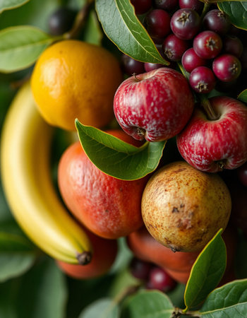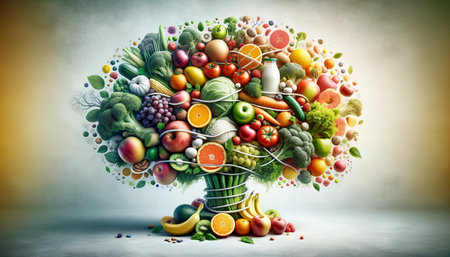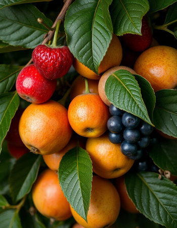 This artistic representation features a whimsical tree adorned with an abundance of colorful fruits. It symbolizes nature's generosity and celebrates the beauty of growth.