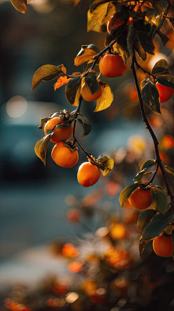 The Persimmon tree in fall, warm amber light, crisp air, shallow depth of field, soft natural bokeh, true to life color, minimal styling.