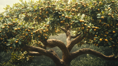 This serene image captures vibrant yellow fruits hanging from lush green branches, surrounded by a misty atmosphere, highlighting nature's beauty and tranquility.