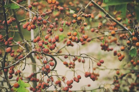 Hawthorn red berries in nature, autumn seasonal vintage background