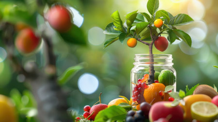 A visually appealing arrangement featuring a miniature tree in a jar surrounded by an array of fresh fruits, evoking feelings of nature's abundance and health.