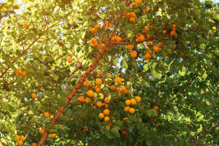 Apricot tree with plenty of ripe fruit on the branches, selective focus