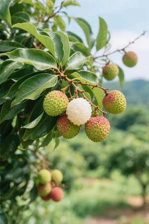 Ripe lychees on a branch in the orchard.