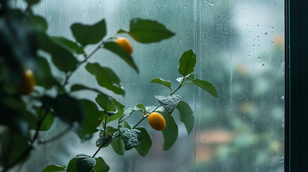 Citrus fruits on the windowsill with raindrops. Selective focus.