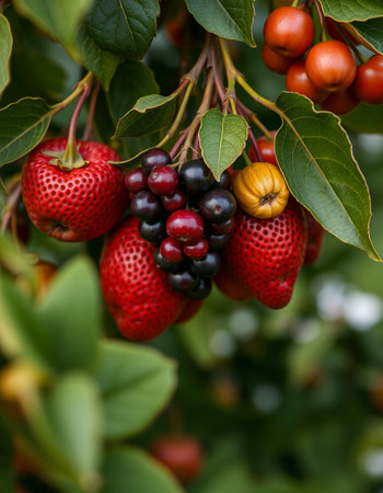This image showcases lush green leaves adorned with bright red berries, emphasizing the beauty of nature. Perfect for enhancing designs related to gardening or organic themes.