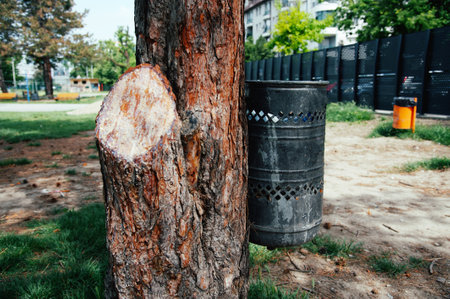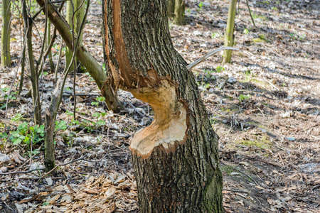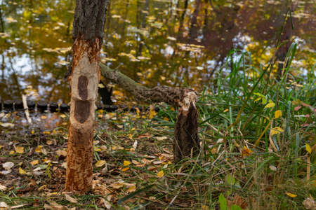 tree trunk bitten by beavers traces of beavers, autumn in the park