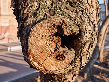 Birch trunk with hollowed hollow. Woodpecker-damaged tree. Selective focus