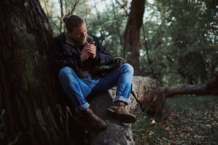 A man lights a cigarette sitting on the trunk of a fallen tree in the woods.