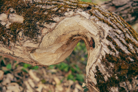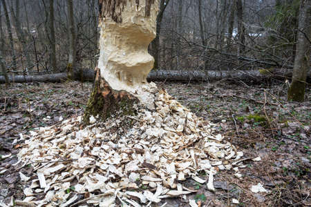 Beaver damage, gnawed tree trunk in the forest near lake Plateliai in Lithuania