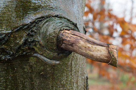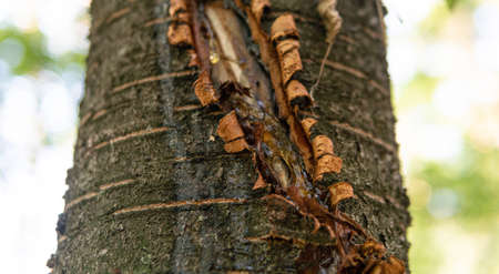 collecting resin from fruit trees close-up