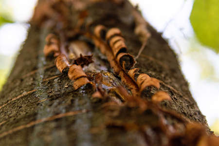 Close up of tree trunk in a botanical garden with green background