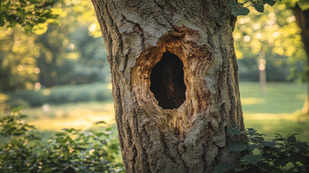 A close-up view of a tree trunk featuring a hollow opening, surrounded by vibrant greenery, showcasing the beauty of nature during golden hour.