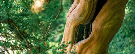 A hollow in a rotten old tree. Part of an old rotten tree trunk with a hollow old tree trunk decorated with woodpecker holes.