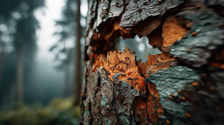 A close-up shot of weathered tree bark showcasing intricate textures, colors, and natural decay. The blurred forest background adds depth and tranquility.