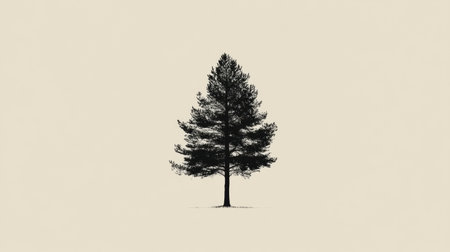 A tall evergreen tree stands alone in a neutral space, its silhouette sharp against the light background, suggesting solitude and calm.