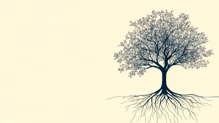 A stylized illustration depicts a tree with lush foliage growing above while its intricate roots stretch beneath. This artwork emphasizes nature's balance and growth.