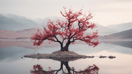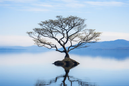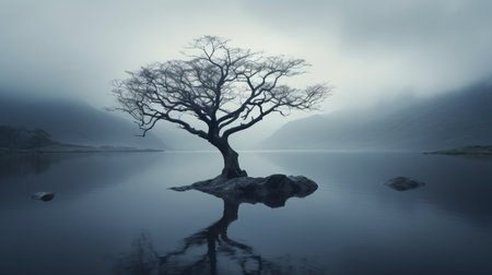 a serene and ethereal image of a small lone tree floating in a calm lake, captured in moody monotones. the ghostly presence of the tree adds a subtle touch to the overall serenity and calmness of the scene. this uhd 32k photograph, reminiscent of national geographic's style, showcases the beauty of nature in a mesmerizing way. ai generated