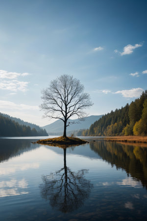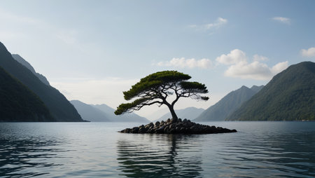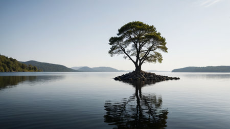 Serene Lonely Tree Standing Proudly on a Tranquil Lake Island Surrounded by Peaceful Nature Scene