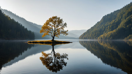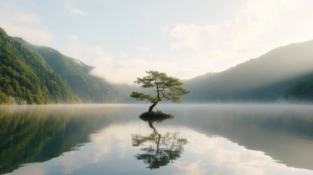 Serene Tranquil Lake with a Solitary Tree on an Idyllic Island Surrounded by Gentle Misty Water