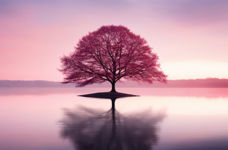 cherry blossom tree in the middle of the lake in a pink sunset, concept peace