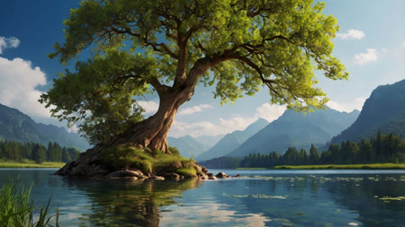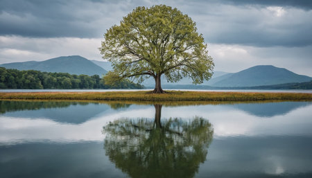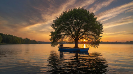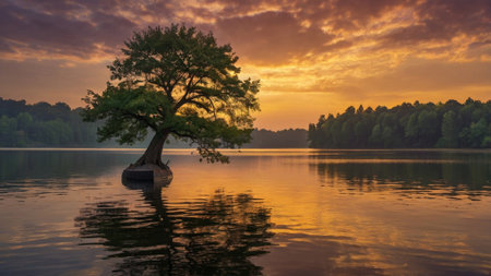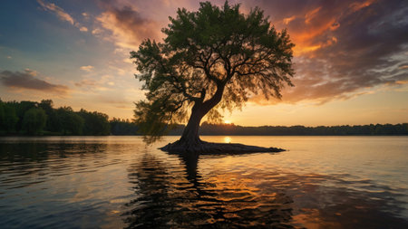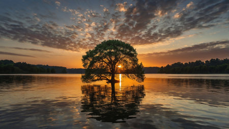 AI Generated. beautiful solitary tree surrounded by calm water on a peaceful lake