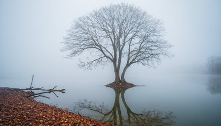 This atmospheric image captures the poignant beauty of a solitary tree standing resilient in calm waters, enveloped by the soft embrace of mist. The delicate branches, bereft of leaves, tell a story of endurance and adaptability. The subtle gradation of blues and grays in the background brings a sense of peace and depth to the image, as the tree's reflection ripples gently across the water's surface. This minimalist scene is perfect for conveying themes of tranquility, the elegance of nature's simplicity, and the reflective quality of solitude. Ideal for use in wellness and meditation spaces, or as a contemplative background for creative projects.