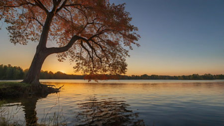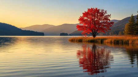 A striking red tree stands prominently on a lake's edge, reflecting in the tranquil water. The scene features warm colors, with a sunset painting the sky and gently illuminating the water's surface. This picturesque view may be suitable for scenic imagery in various commercial and editorial projects.