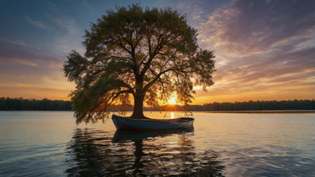 Sunset on the lake with a lonely tree and a boat.