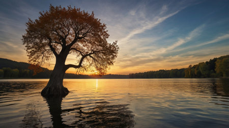 Beautiful sunset over the lake with a tree reflected in the water