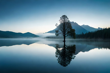 A stunning scene capturing a solitary tree standing by a calm lake, its reflection beautifully mirrored in the water beneath a gentle morning fog, evoking serenity and stillness.