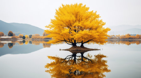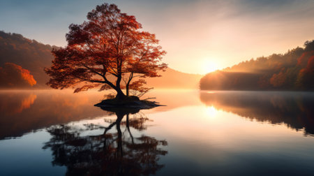 Autumn tree by a misty lake reflection scene