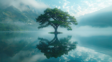 Serene tree stands alone on a foggy lake surrounded by mountains at dawn
