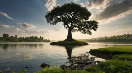 A majestic lone tree with green foliage standing in calm waters against a serene landscape