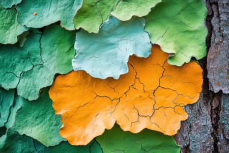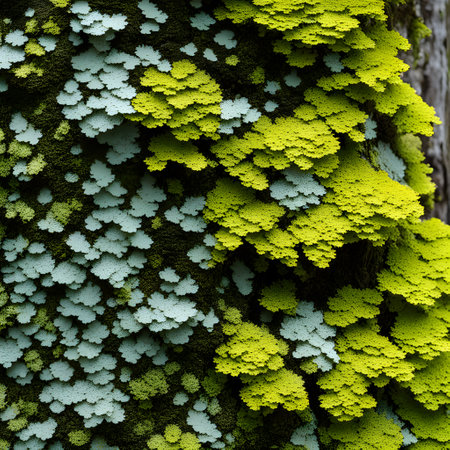 This close up view displays the intricate patterns of lichen on a tree trunk highlighting vibrant greens and oranges. Natural textures blend harmoniously in this living organisms habitat.