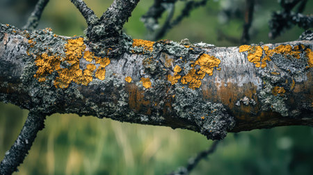 Vibrant lichen covers a weathered tree branch in a lush forest setting showcasing natures textures and colors in a tranquil environment.