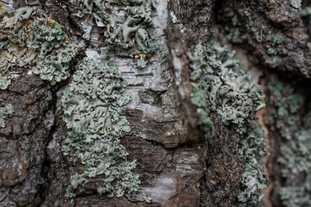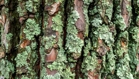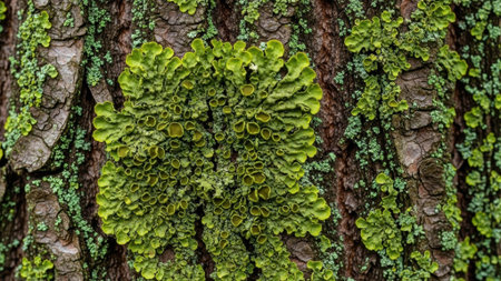 An intimate macro shot of lichen on bark revealing a network of intricate green s against the gnarled and weathered surface of the bark illustrating the symbiosis between the two