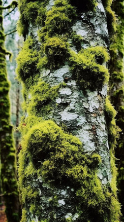 Explore the intricate detail of tree bark adorned with vibrant green moss and lichen, highlighting the beauty of nature in a serene forest environment.